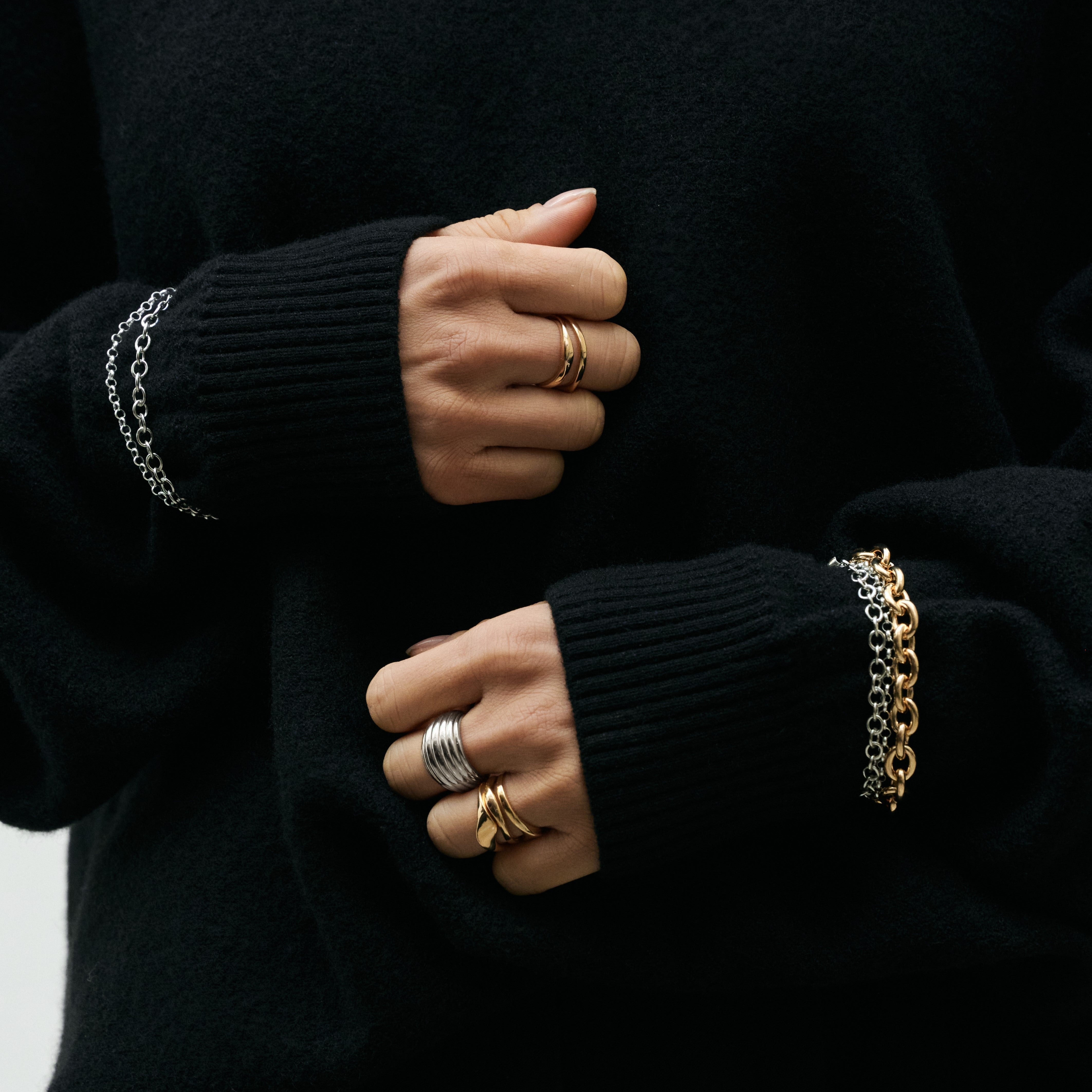 La modèle porte les bijoux : AMBITIEUX, SENSIBLE, HUMBLE, INACCESSIBLE, ÉLOQUENTE, ATTACHANTE, INDÉPENDANTE & PRAGMATIQUE